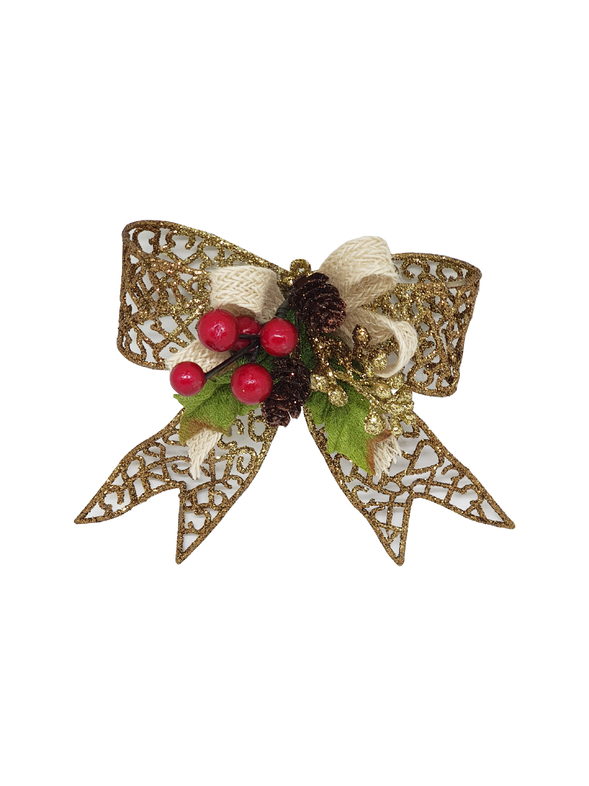 1 x Bow with gold glitter, red and gold berries, green foliage and artificial mini pinecones complete with cotton cord bow.