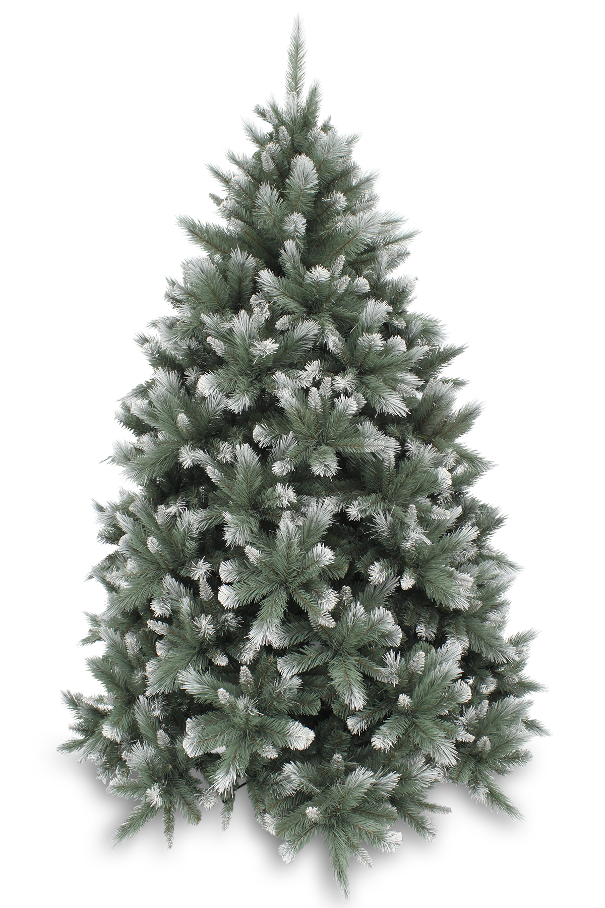 For that real snowy mountain feel, we have created a super deluxe hinged blue green tree with frosted white tips. We mix a selection of 3 types of tips-foliage into the branches to create a very natural and realistic winter Christmas look.