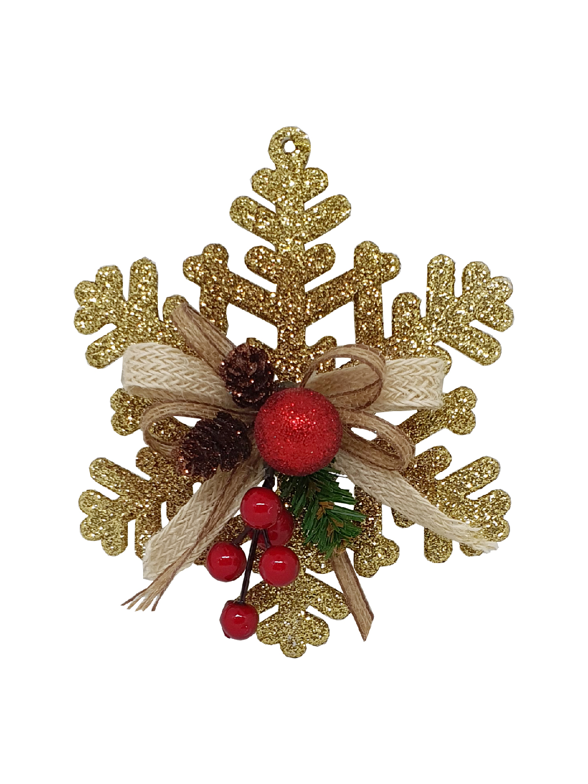 1 x Snowflake with gold glitter, red ball and berries, green foliage and artificial mini pine cones complete with cotton cord bow.