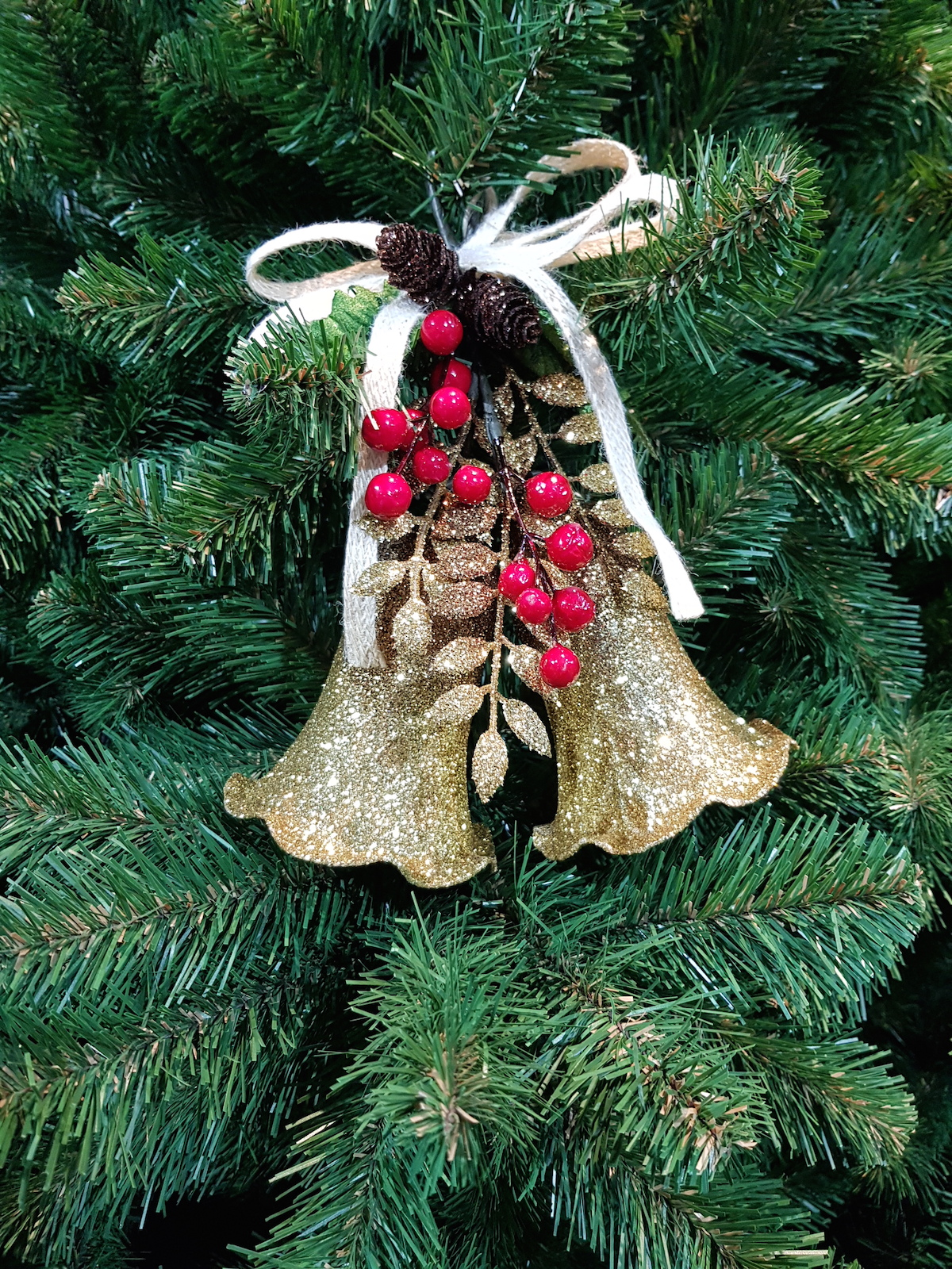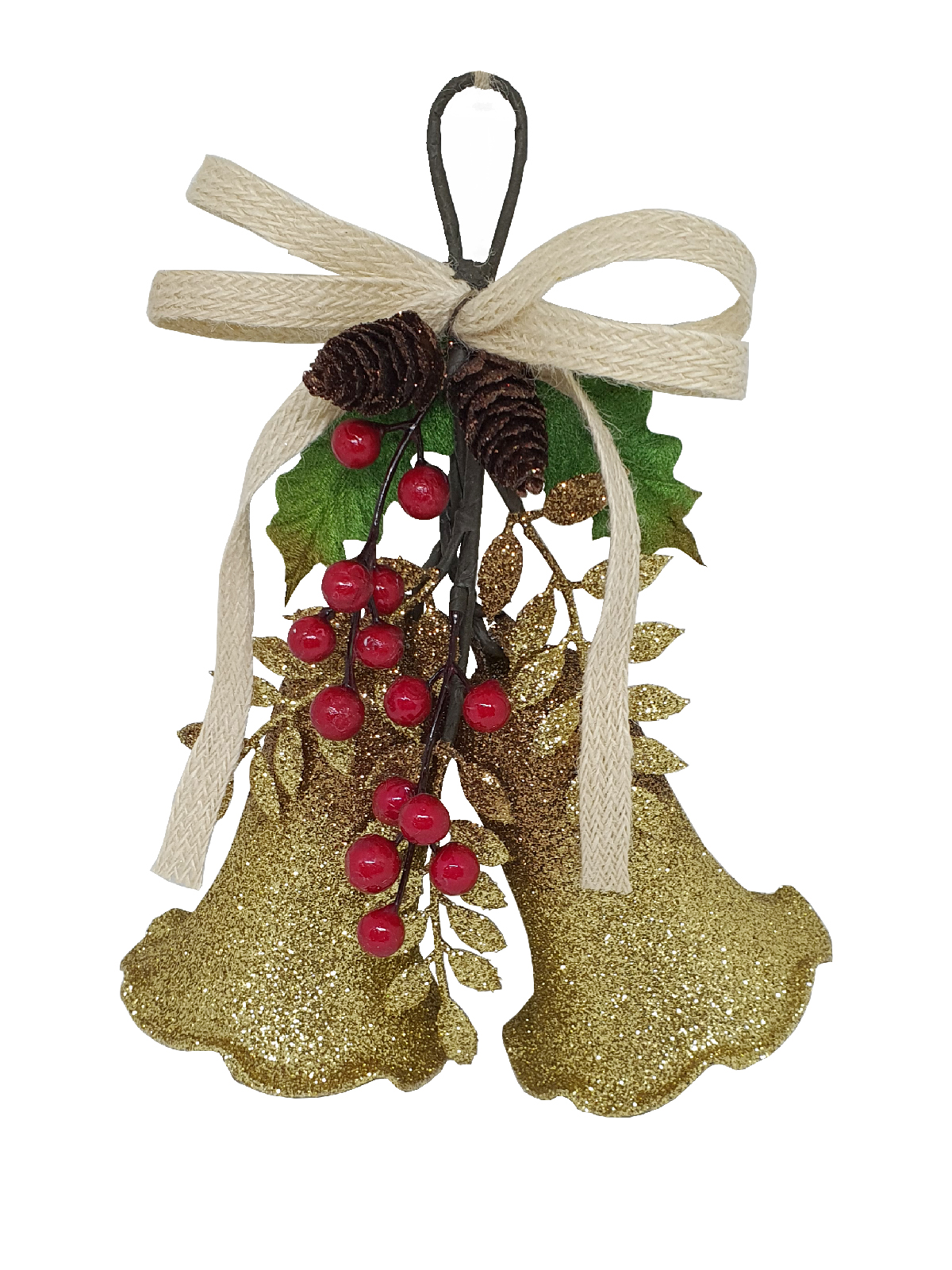 A 3-dimensional double gold glitter set of Bells with red berries, gold glitter foliage, green leaves and artificial pine cones complete with cotton cord bow.