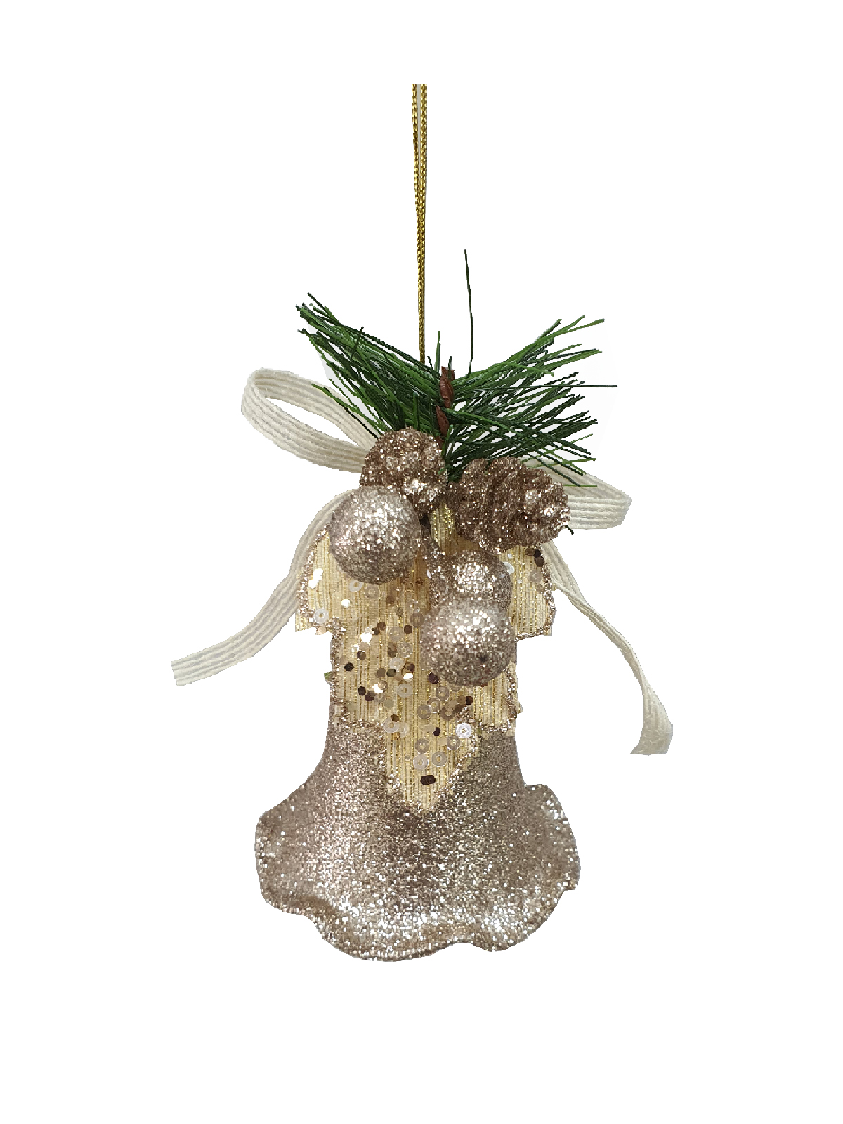 1 x Bell with champagne glitter, champagne berries, champagne leaves, green foliage and artificial pinecones complete with cotton cord bow.