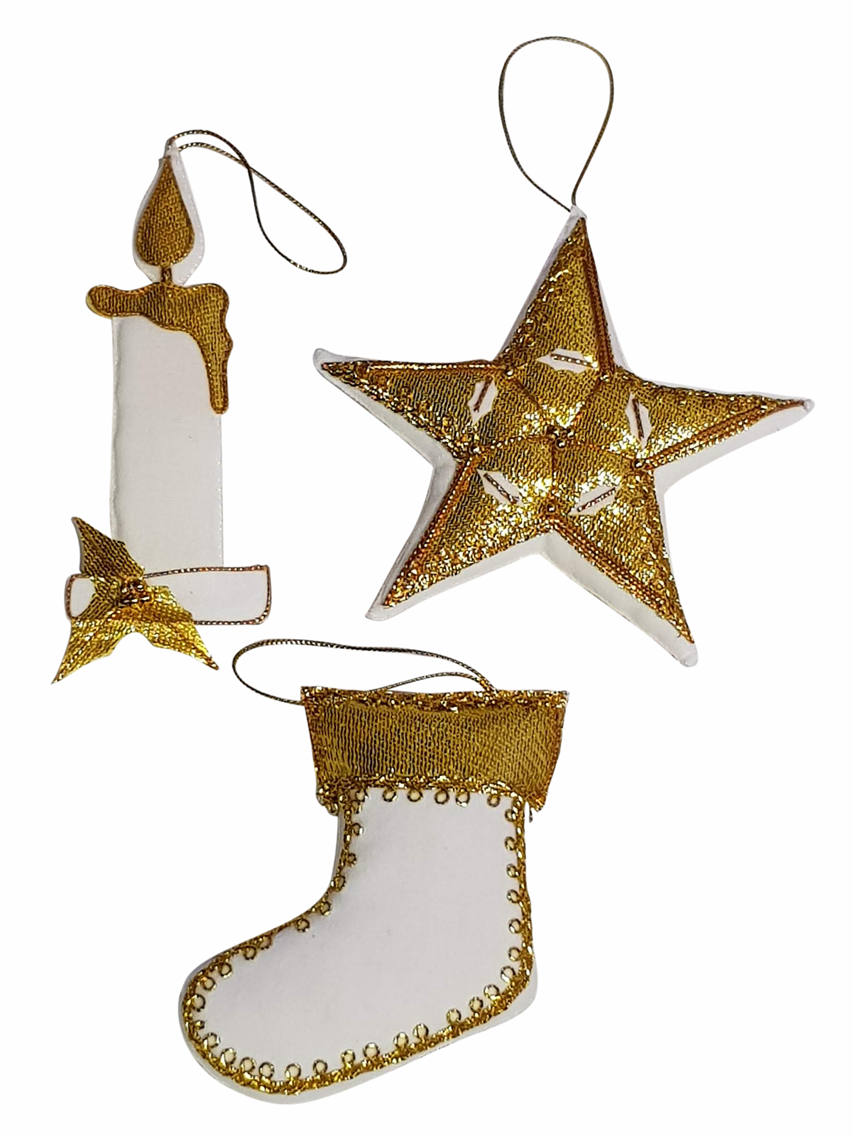 Christmas Decoration set Stocking, Star and Candle White/Gold – Hand Made