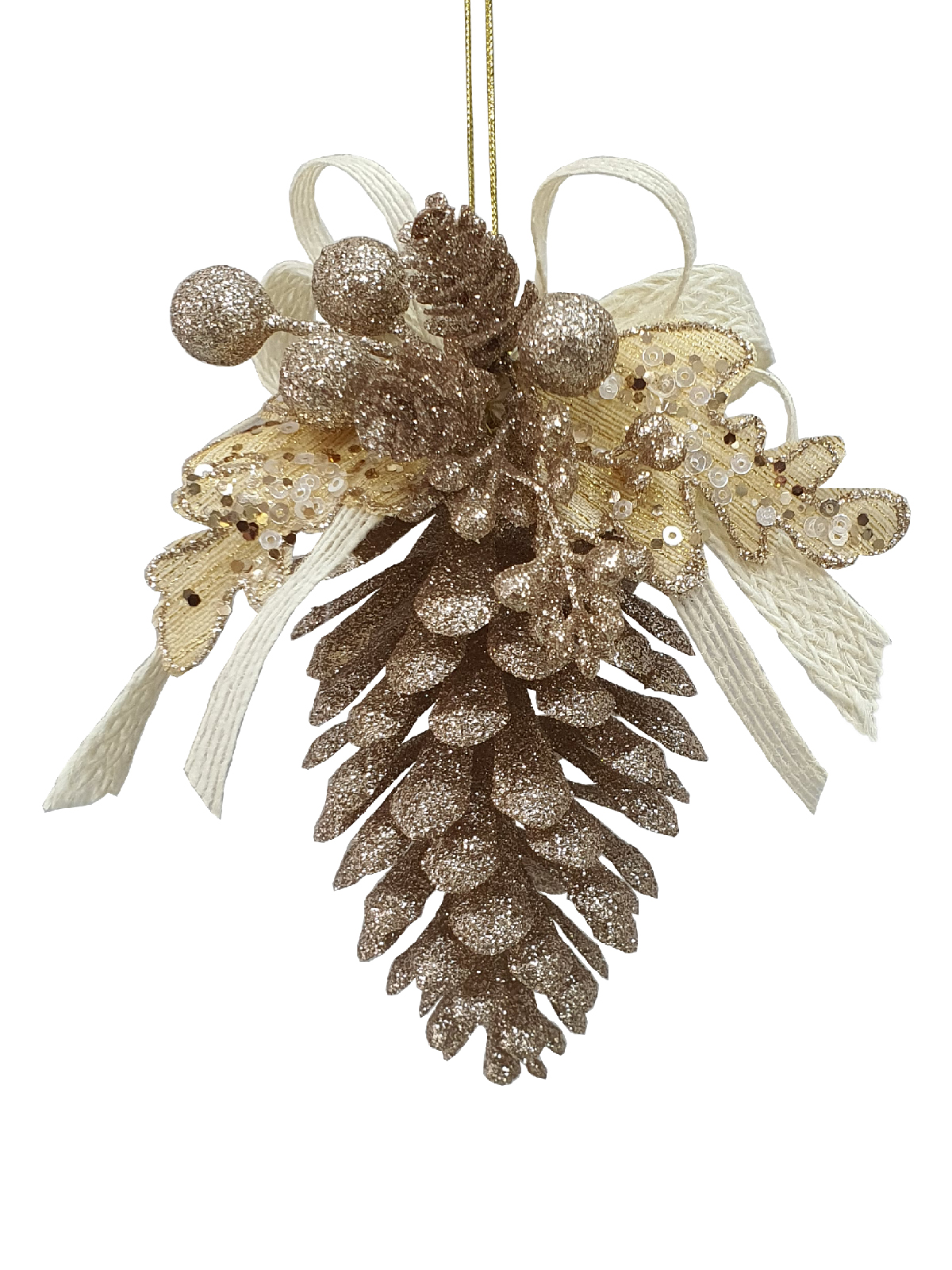 1 x Artificial large pine cone with champagne glitter, champagne berries, champagne leaves and artificial mini pine cones complete with cotton cord bow.